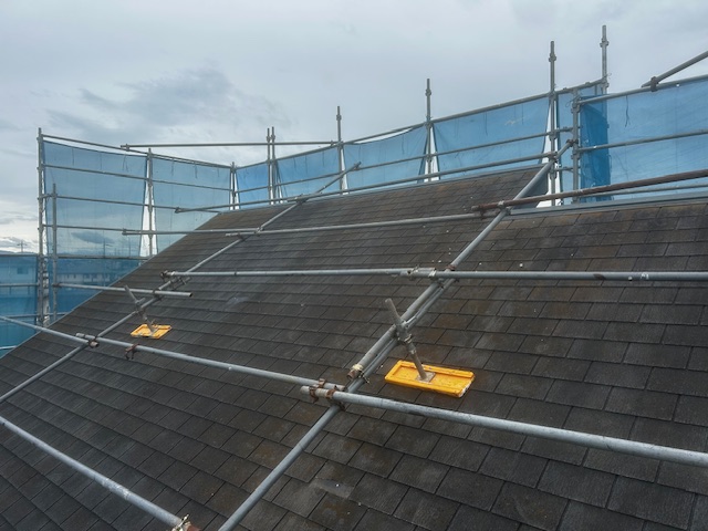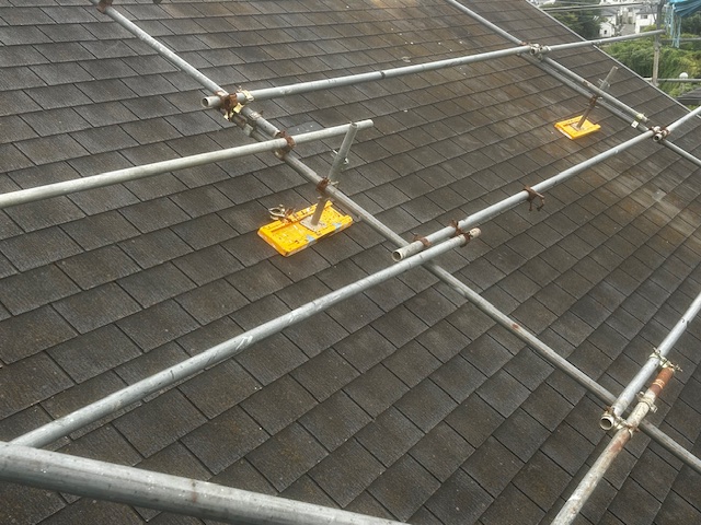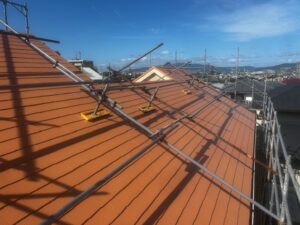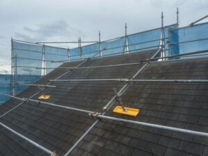 屋根の勾配が急な場合でも、適切な角度で足場を組むことで、職人が安定して作業できる環境を確保します。