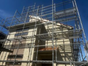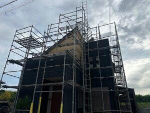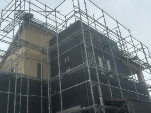 戸建て住宅の屋根工事や外壁塗装に伴う足場設置では、建物全体を安全に覆う枠組み足場を採用しています。