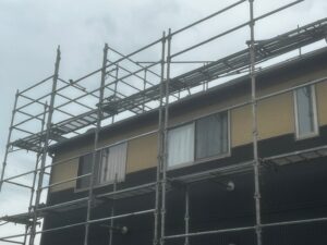 足場工事とは、建物の外壁塗装や屋根工事、外装リフォームなどを安全に行うために、建物の周囲に仮設の作業床を組み立てる工事です。